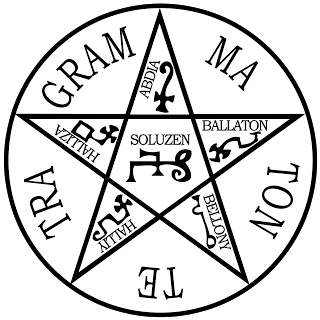 Enochian is a language revealed by John Dee in the Renaissance via his seances with angels. I honestly originally thought they just scribbled shapes, but upon further examination, they really did use Enochian letters.